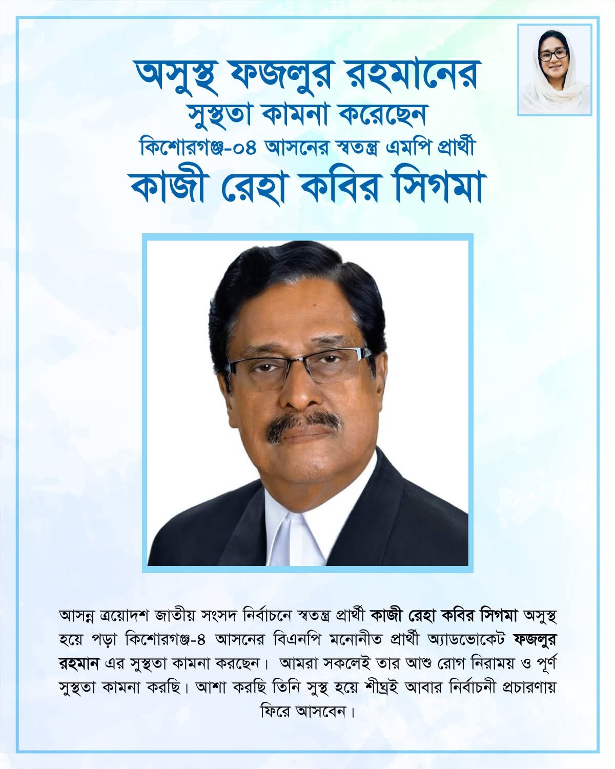 অসুস্থ অ্যাডভোকেট ফজলুর রহমানের সুস্থতা কামনা করলেন স্বতন্ত্র প্রার্থী কাজী রেহা কবির সিগমা।